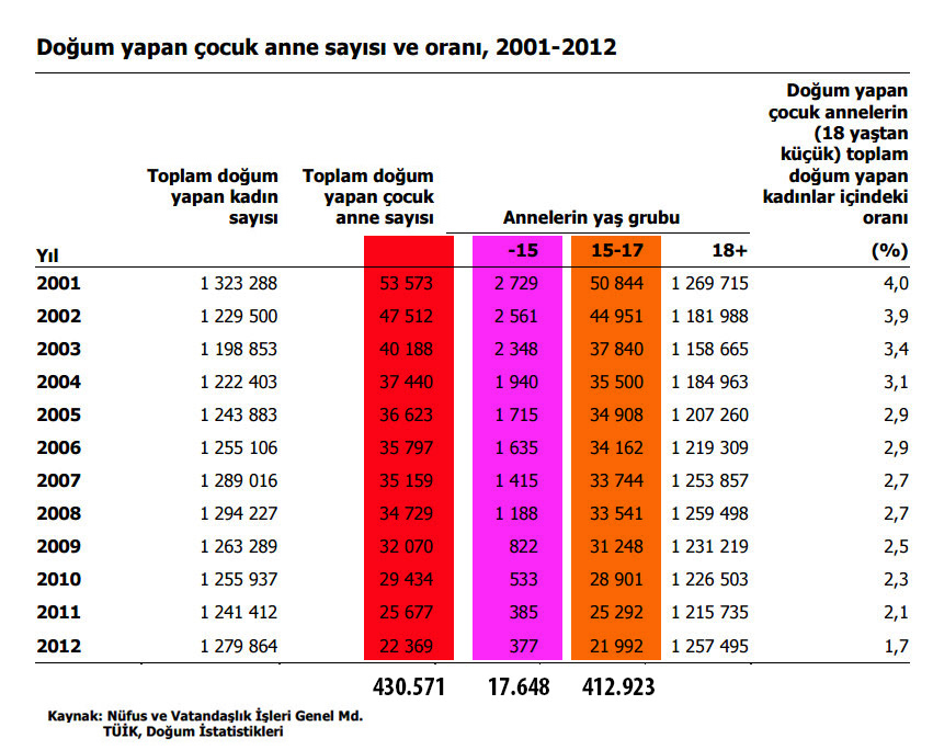 Şimdi de 2001 - 2012 yılları arasındaki çocuk anne sayılarına bakalım. Türkiye İstatistik Kurumu Başkanlığının verilerine göre 2001 - 2012 yılları arasında 15 yaş altı 17.648 çocuk anne oldu. Aynı zaman diliminde 15 - 17 yaşları arasında anne olan çocukların sayısı ise 412.923