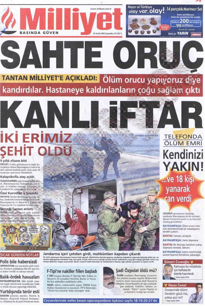 Tüm o demokrasi ve bireyselleşme âşıkları hayata güzellemeler yaparken o meş’um gün geldi çattı ve kadife eldivenden fırlayan demir yumruk 19 Aralık gecesi 20 zindana iniverdi. 3 gün süren tufanda 32 kişi yanarak, kurşunlanarak can verdi. İkisi askerdi… Yıllar sonra bu iki askerin de jandarma kurşunuyla öldüğü açığa çıktığında hayat sevici liberaller çıtlarını çıkarmayacaklardı elbette… Ve o tufandan hemen önce Tuncay Özkan’lar, Gülay Göktürk’ler son kulvara açık ara önde girmişken ipi Tolga Şardan ve Mehmet Y. Yılmaz ikilisi göğüsleyecekti. Basın tarihinin gelmiş geçmiş en iğrenç manşetlerinden birine imza atmayı başardılar: “Sahte Oruç Kanlı İftar!”
