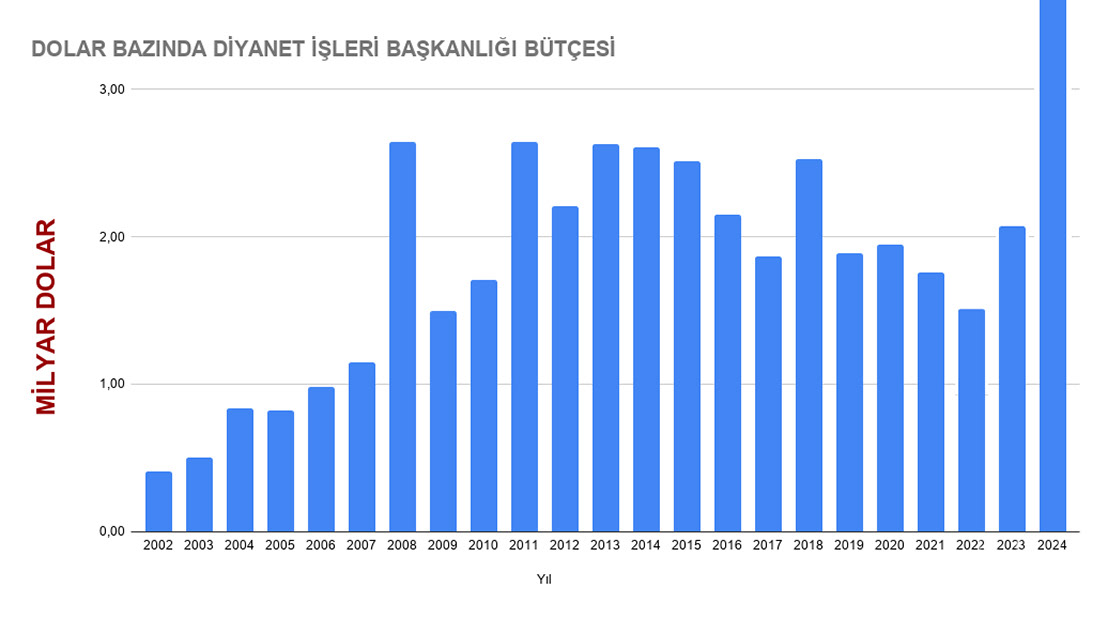 Uzun süreli bir hesap yapmaya kalkıştığımızda karşılaşacağımız en temel sorun Türk Lirası’nın istikrarsız bir para birimi olması. Bu sebeple Diyanet’e harcadığımız parayı hesaplarken bütçenin dolar karşılığının ne olduğunu bulmaya çalıştım. Bunun için de doların o yıllardaki ortalama değerini temel aldım.