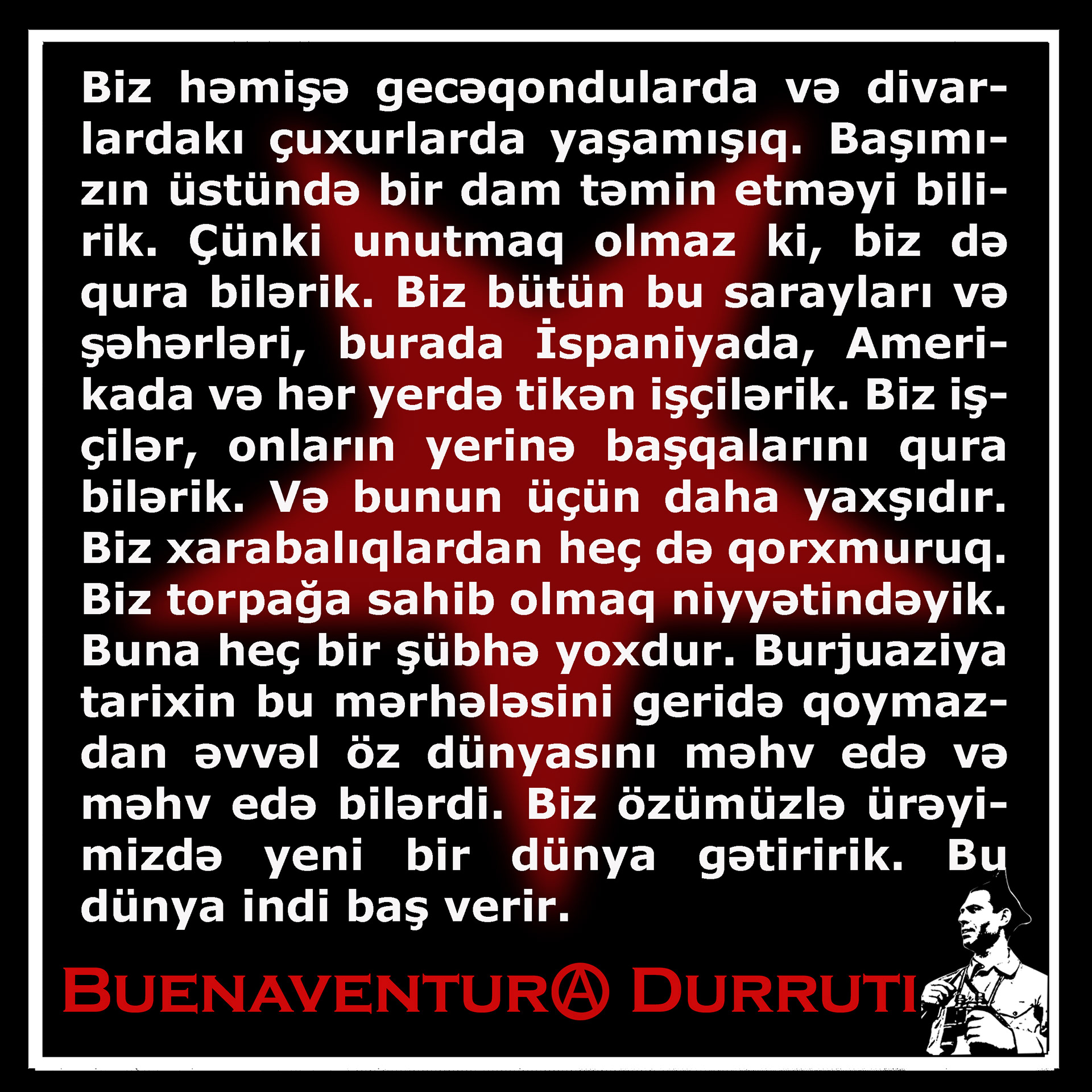 Biz həmişə gecəqondularda və divarlardakı çuxurlarda yaşamışıq. Başımızın üstündə bir dam təmin etməyi bilirik. Çünki unutmaq olmaz ki, biz də qura bilərik. Biz bütün bu sarayları və şəhərləri, burada İspaniyada, Amerikada və hər yerdə tikən işçilərik. Biz işçilər, onların yerinə başqalarını qura bilərik. Və bunun üçün daha yaxşıdır. Biz xarabalıqlardan heç də qorxmuruq. Biz torpağa sahib olmaq niyyətindəyik. Buna heç bir şübhə yoxdur. Burjuaziya tarixin bu mərhələsini geridə qoymazdan əvvəl öz dünyasını məhv edə və məhv edə bilərdi. Biz özümüzlə ürəyimizdə yeni bir dünya gətiririk. Bu dünya indi baş verir.